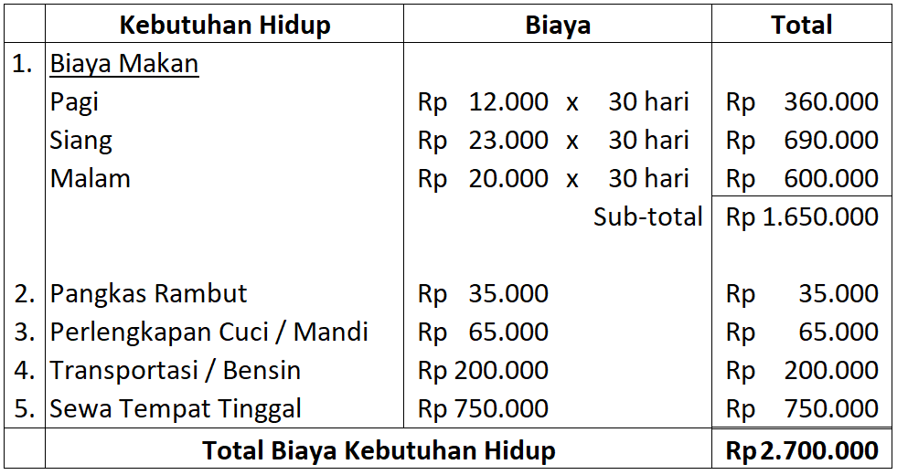 Setelah mengetahui besaran biaya hidup mu, maka kamu bisa mengetahui ada berapa duit yang tersisa dari pendapatanmu. Misalkan pendapatan bulananmu berkisar diangka Rp 3,5 juta, maka uangmu tersisa yaitu Rp 800 ribu.