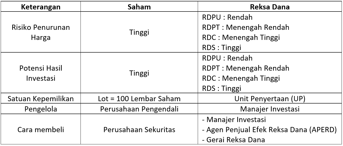 Setelah mengetahui perbedaannya, kamu dapat lihat bahwa jenis ragam pilihan di Reksa Dana lebih banyak dari pada Saham. Nah dari sini kamu dapat menyesuaikan dengan profil kamu, apakah kamu tipikal yang suka investasi dengan risiko penurunan harga yang kecil atau kamu justru suka mengambil tantangan dengan berinvestasi di instrumen yang berisiko tinggi?