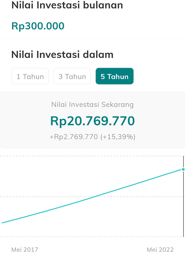 Jadi dari simulasi diatas, selama 5 tahun cukup dengan investasi Rp 10 ribu per hari, kamu mendapat pertumbuhan dana investasi sebesar Rp 2,76 juta dengan risiko rendah dan terukur. Apabila kamu konsisten investasi dengan modal yang lebih besar maka pertumbuhan nilai investasimu tentu jauh lebih besar. Namun perlu diingat juga bahwa kinerja masa lalu tidak mencerminkan kinerja masa depan.