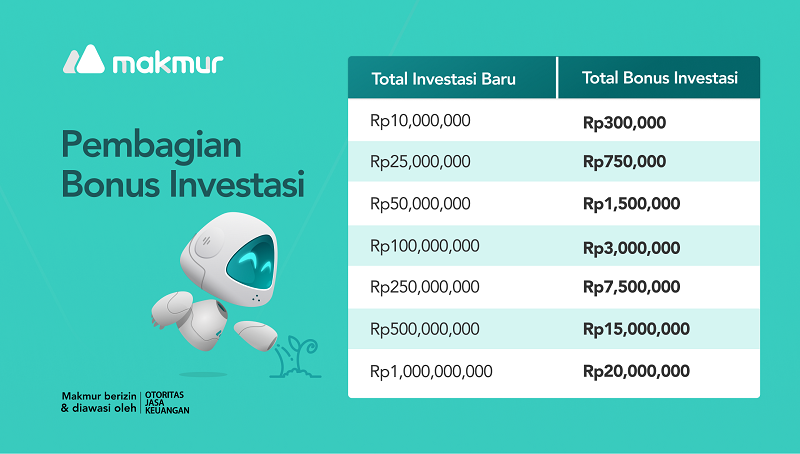 4. Total bonus investasi yang didapatkan adalah 3% dari nilai Investasi Baru pada promo bonus mingguan Juli 2023 dengan maksimum Rp 20 Juta dalam bentuk unit penyertaan reksa dana yang dibeli.